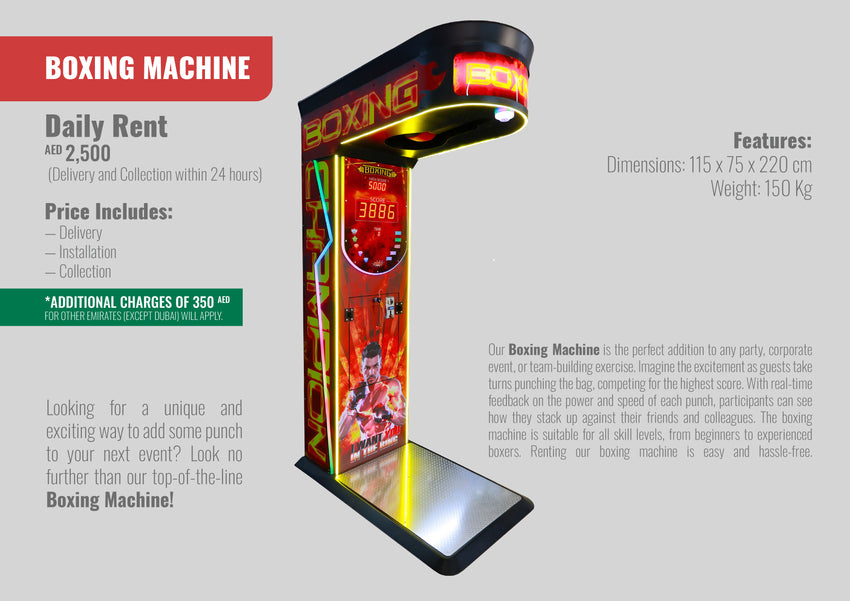 Make your event a knockout with our Champion Boxing Machine. Ideal for adding a competitive edge to your gathering, it will captivate your guests. Your family, colleagues, and friends will be eager to test their strength.