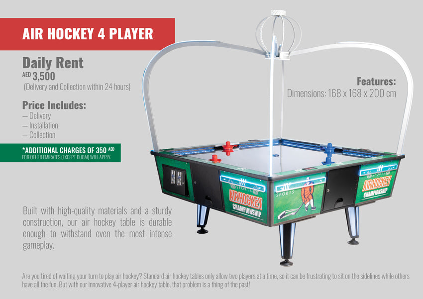 Make your event a hit with our Champion Air Hockey Arcade Game for 4 players. Perfect for any gathering, it will add fun and excitement. Its engaging design will attract your guests. Your family, colleagues, and friends will have a blast competing.