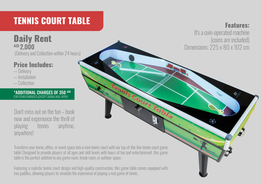 Make your event a grand slam with our Champion Tennis court table. Perfect for outdoor, beach, or park gatherings, it will add fun and excitement. Your family, colleagues, and friends will love participating in this unique activity.