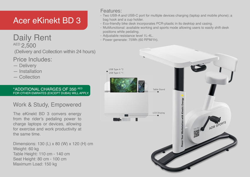 Looking to combine productivity with a healthy lifestyle? The Acer eKinekt BD3, a unique desk bike, is perfect for your next rental. Boost your energy and stay active while you work or hold meetings. Its ergonomic design and quiet operation make it ideal for any environment. Surprise your team, friends, or family with this innovative, eco-friendly addition—guaranteed to keep everyone engaged and energized!